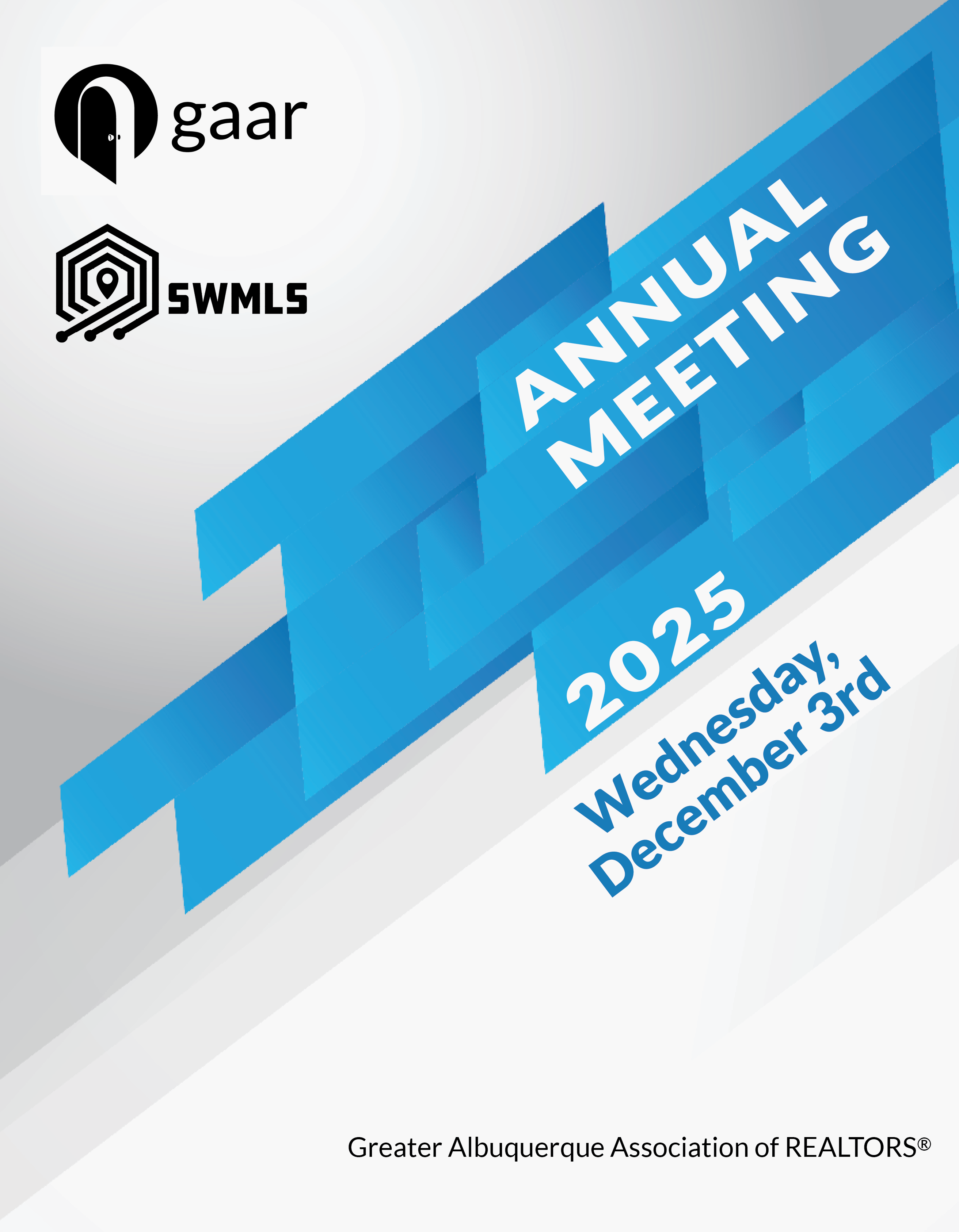 October 31, 2025 - This communication serves as official notice to Members of the Greater Albuquerque Association of REALTORS® and Participants of the Southwest Multiple Listing Service that the 2025 GAAR & SWMLS Annual Meeting will be held on Wednesday, December 3, 2025.