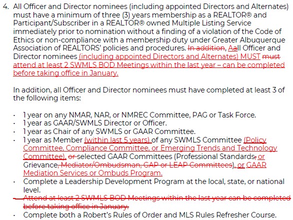 The SWMLS Board increased the minimum qualifications for serving on the SWMLS Board. In addition, they clarified the need for direct experience with SWMLS processes and proceedures or service on select GAAR committees or programs.