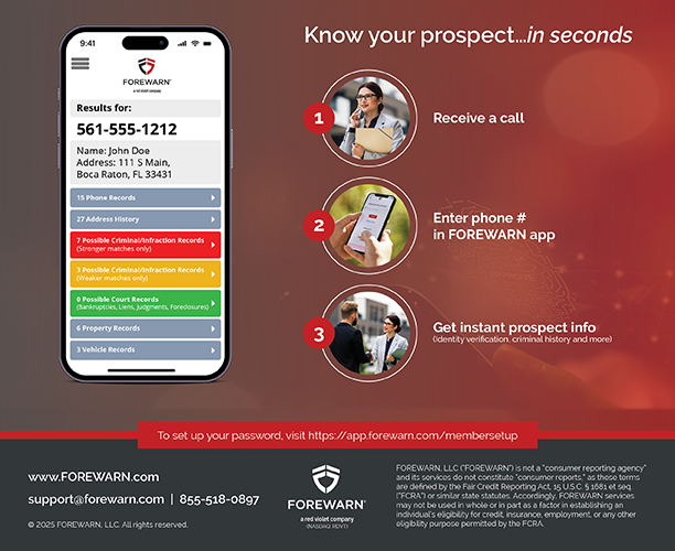 As a REALTOR®, your safety and peace of mind matter — and you have a powerful tool at your fingertips. FOREWARN is included in your subscriber dues, giving you instant access to background information on potential clients with just a phone number.
