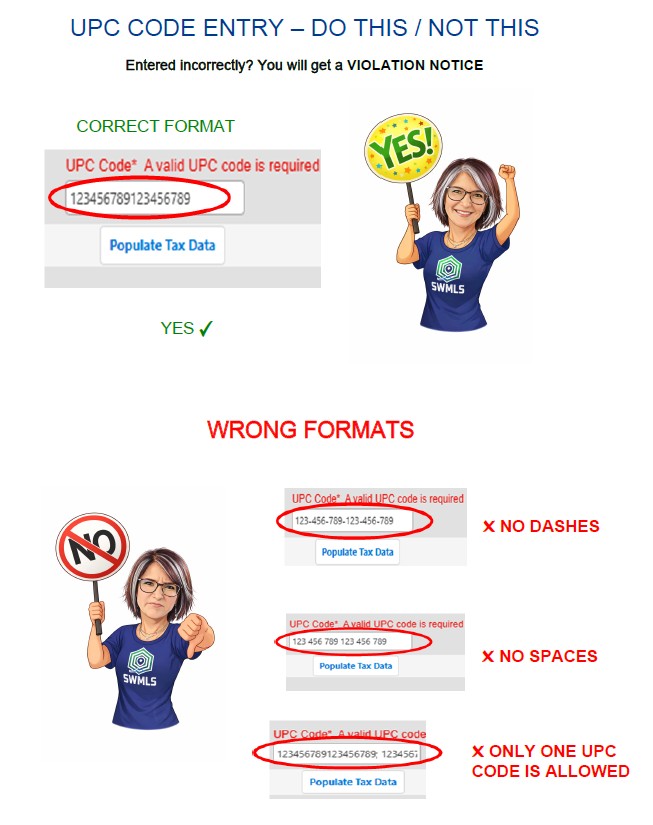 If you find older listings with UPC Codes that include dashes or spaces, contact SWMLS staff immediately. These records must be corrected manually.