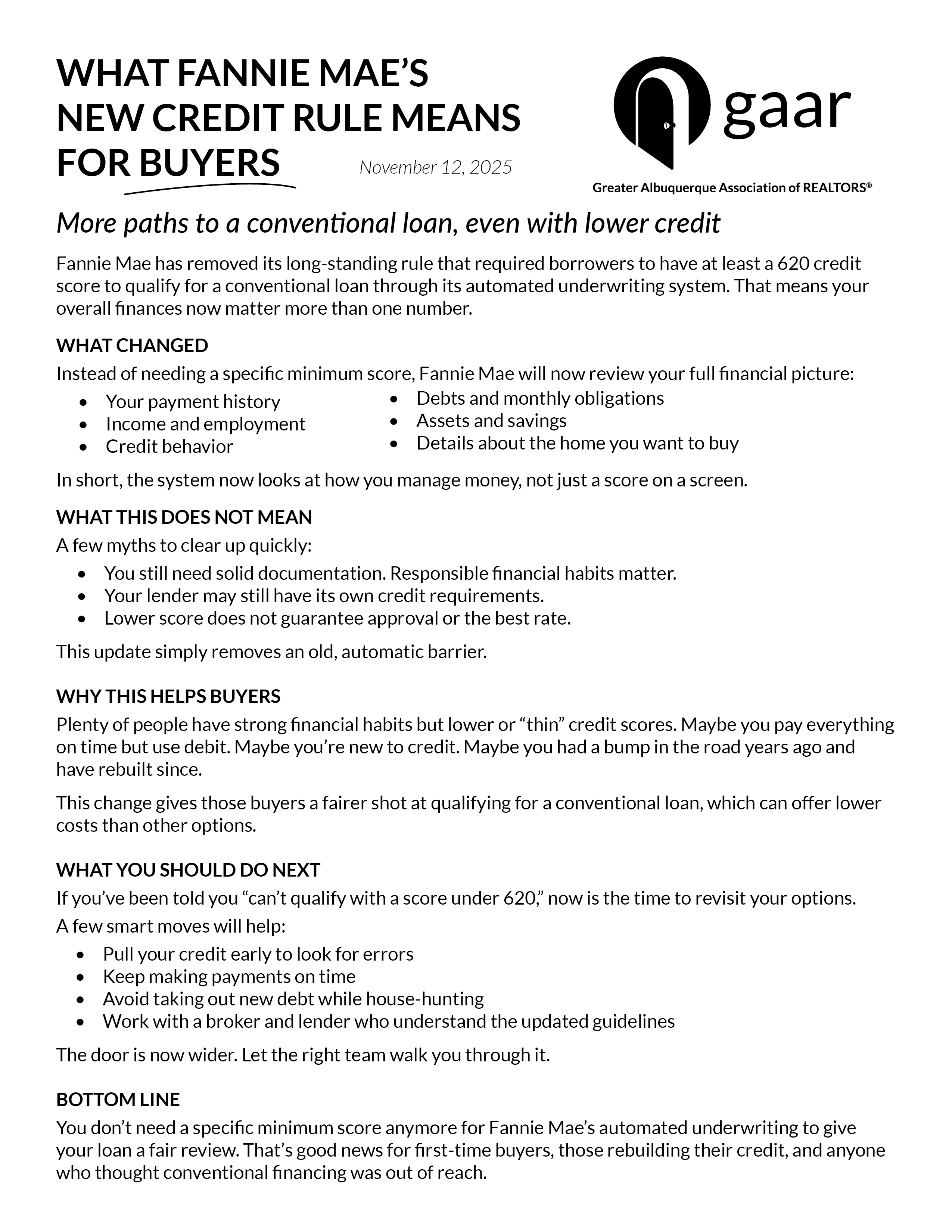 In our market — Albuquerque and New Mexico more broadly — housing affordability is under strain: elevated interest rates, rising home prices, and fewer first-time buyers. For many would-be buyers, credit score has been a barrier even when fundamentals looked solid.