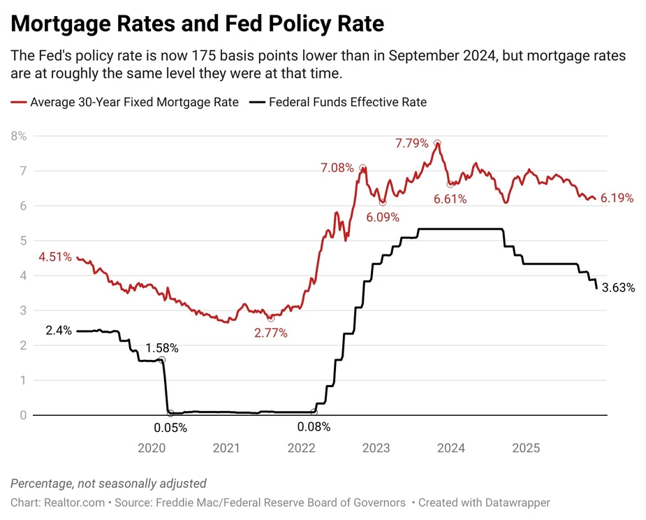 The Fed policy rate is now 1.75 percentage points lower than in September 2024, but mortgage rates have not experienced commensurate declines. In fact, last week's average mortgage rate of 6.19% remains slightly higher than the two-year low reached in September 2024.