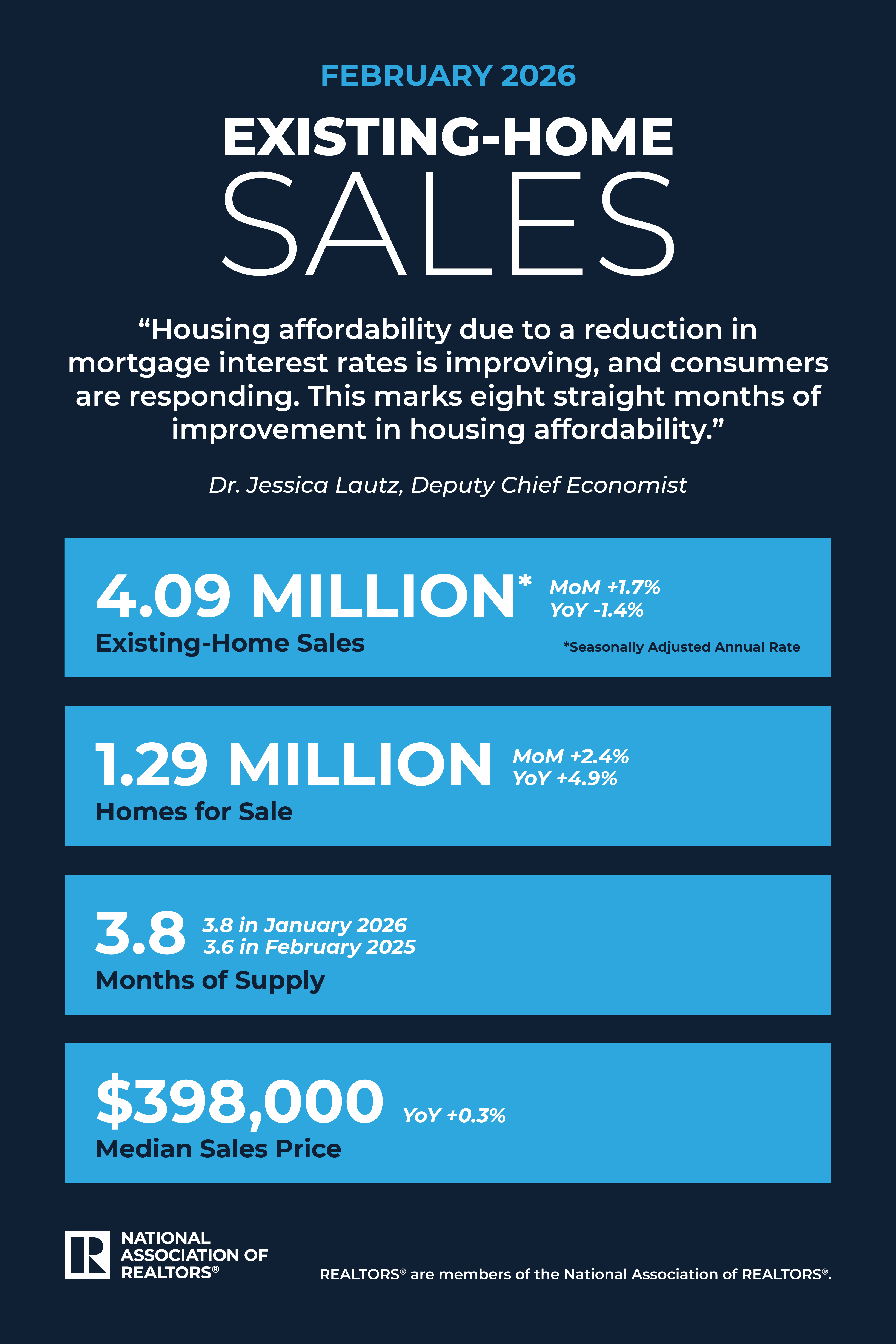 Climbing out of a gloomy winter, existing-home sales reversed course following a sharp drop in January and ticked up slightly in February as housing affordability improved nationwide, the National Association of REALTORS® reported Tuesday. Lower mortgage rates, rising wages and slower price growth are offering improving conditions for prospective home buyers. First-time buyers also made a modest return to the market last month.
